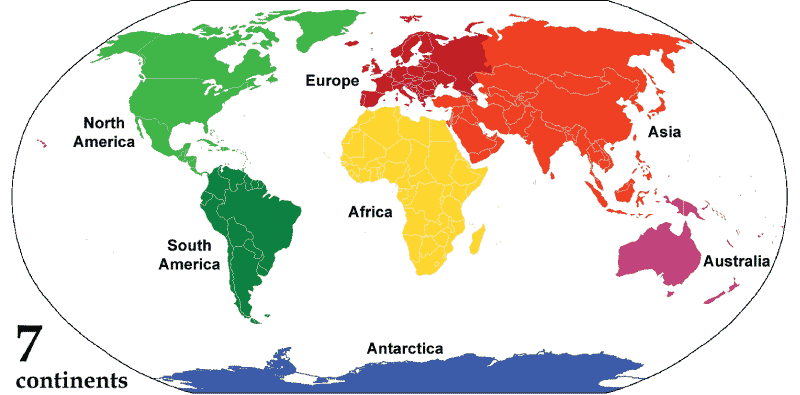 The Earth has seven very large areas of land that are called called continents. They are, from the largest to the smallest: Asia, Africa, North America, South America, Antarctica, Europe, and Australia. Islands are usually are usually considered to be part of the nearest continent.
